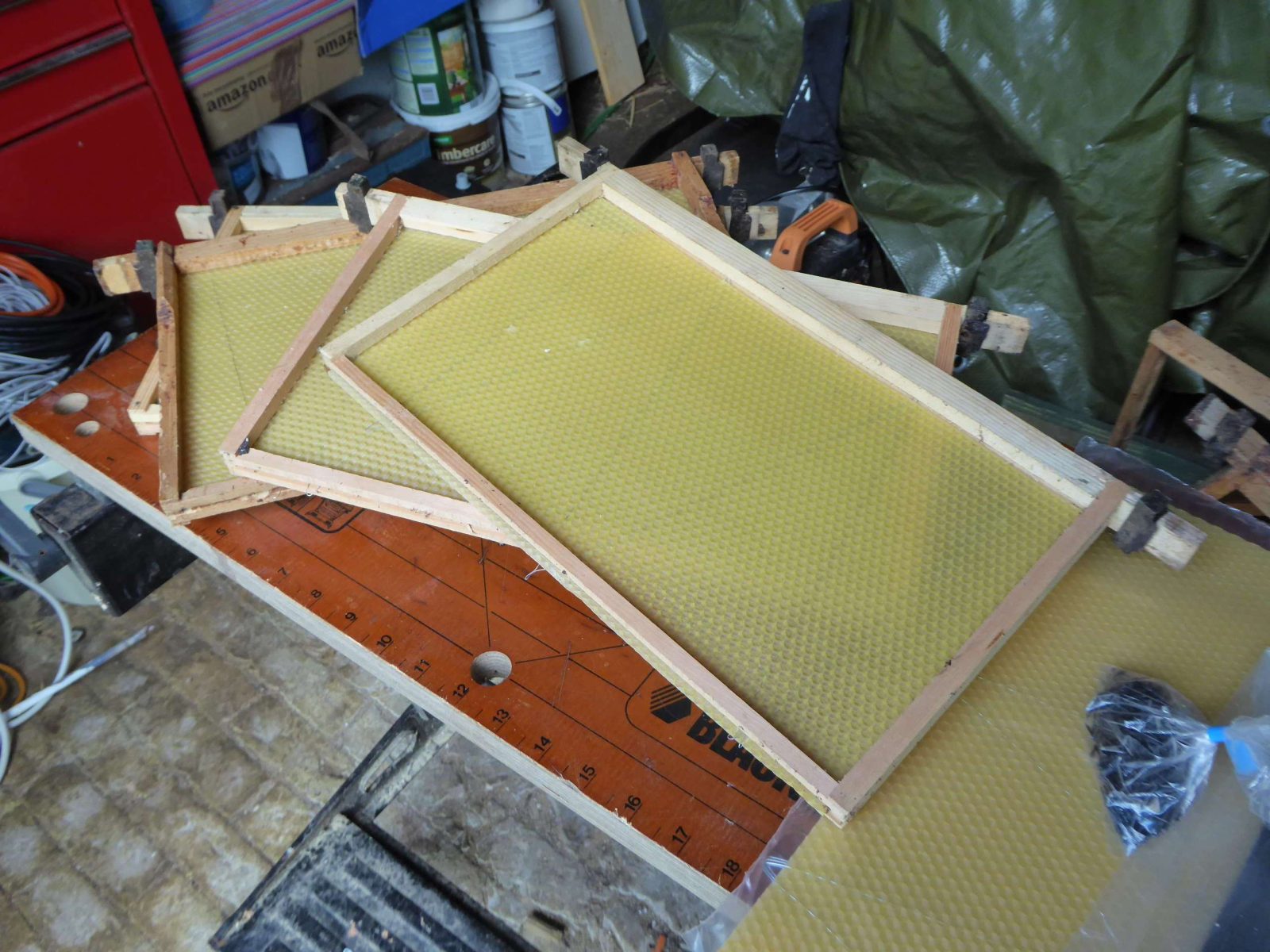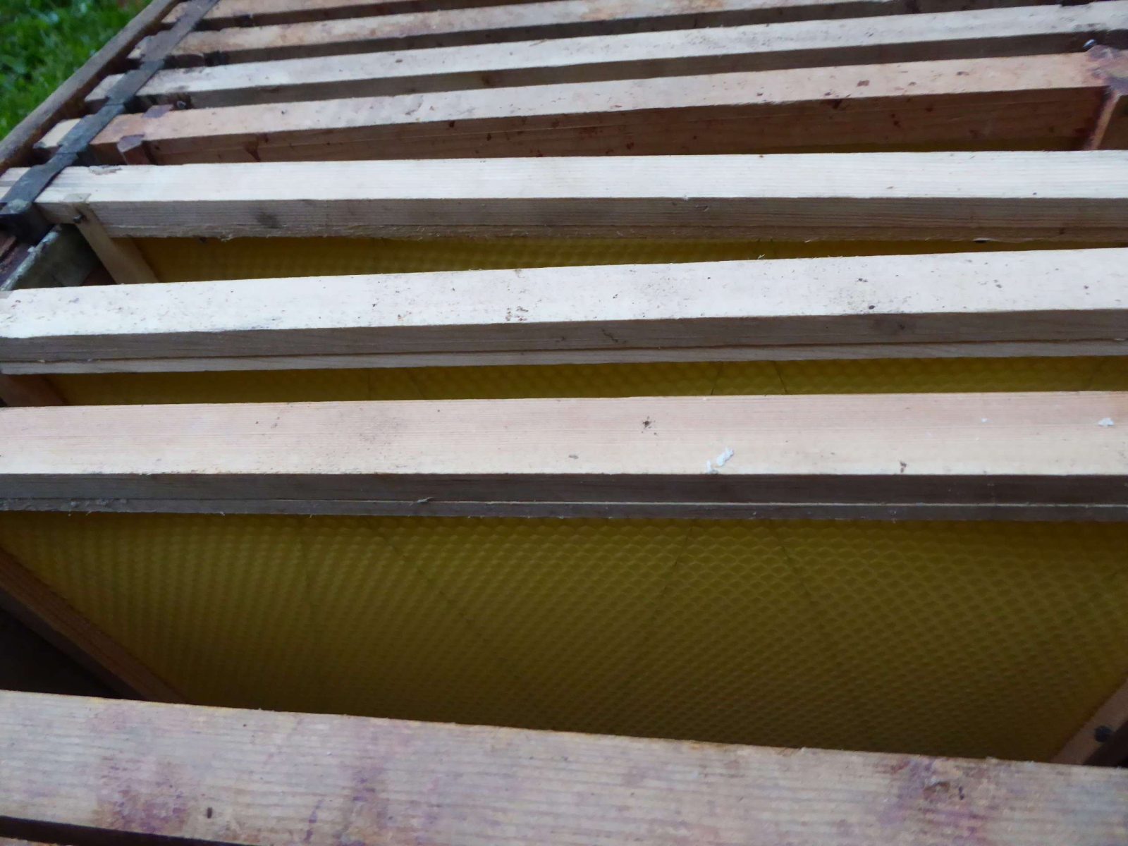 We spent some time preparing by putting a new wax foundation sheet into each of the wooden frames within the brood box of the hive. This gives the bees a head start when they arrive and makes sure that they use all the available space on the square frame to make their cells. Bees can smell the wax and so for a while we did have a few interested local bees checking out the hive.