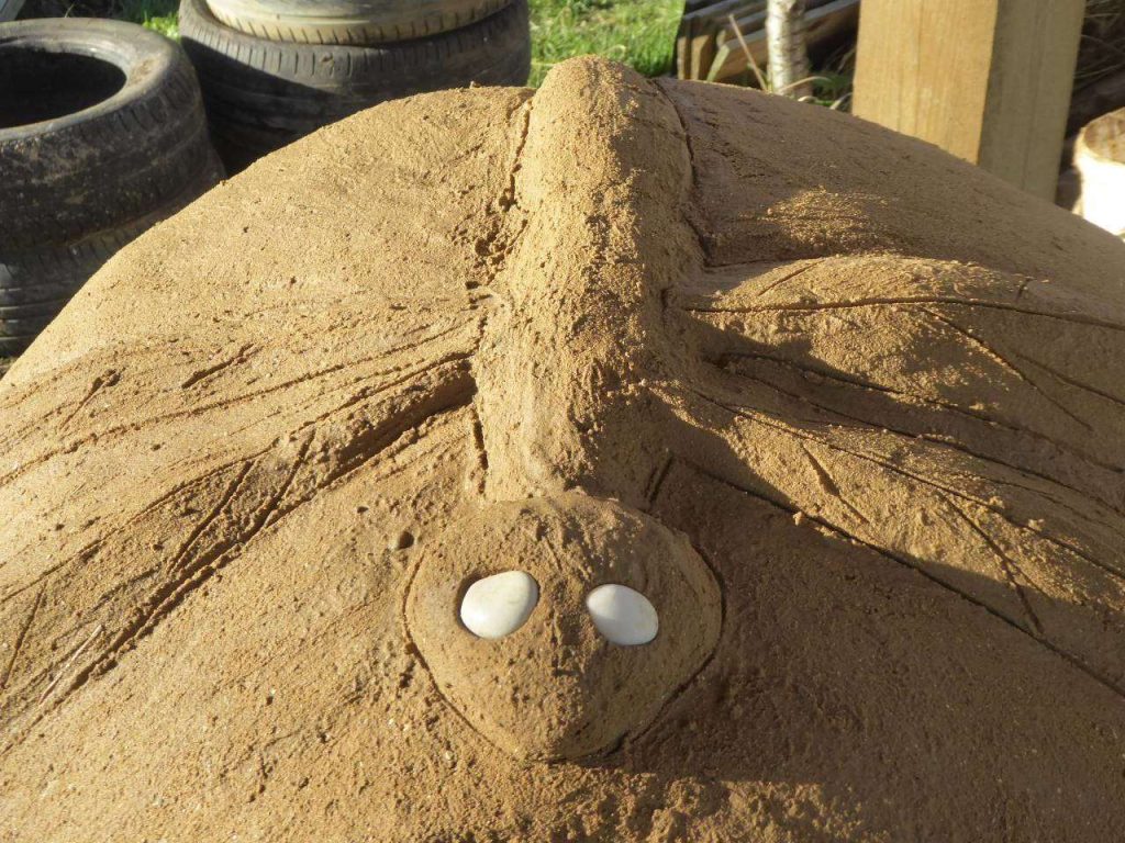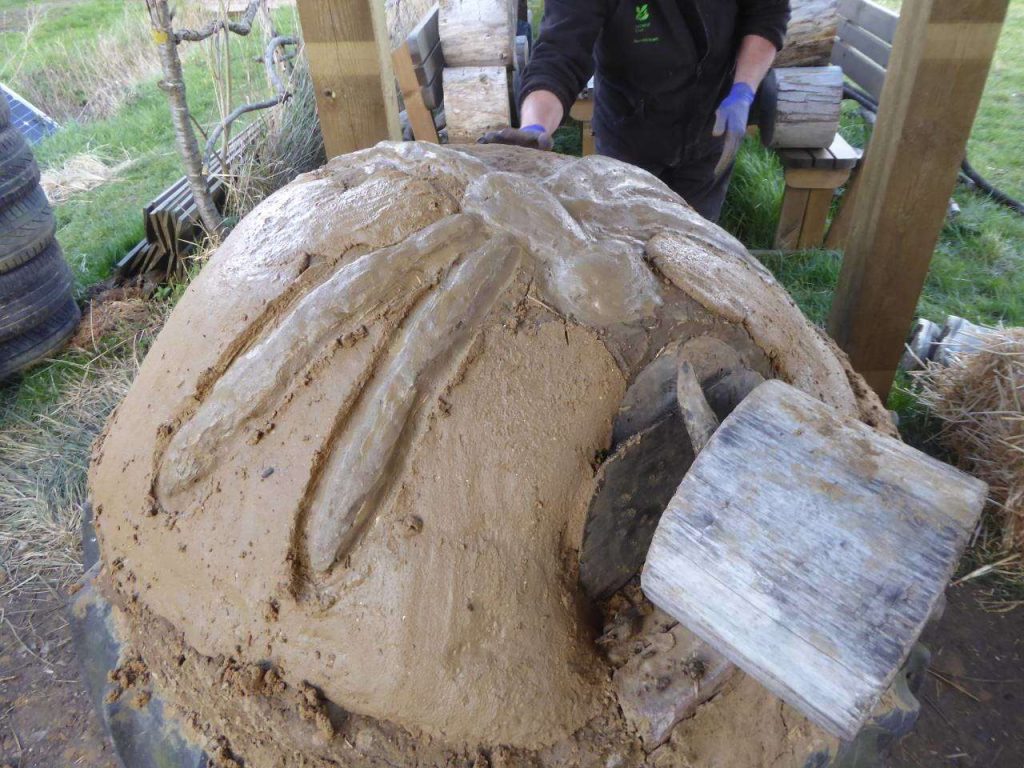 The final layer is a sacrificial top coat of clay render. The raw clay was soaked and then the resulting clay/water mix was run through a garden sieve to remove any lumps and stones. We then used five parts sand to one part clay to make the render. The top coat needs to be about 1cm thick and will protect the cob. We took the time to add a dragonfly decoration at this point to finish off our oven.