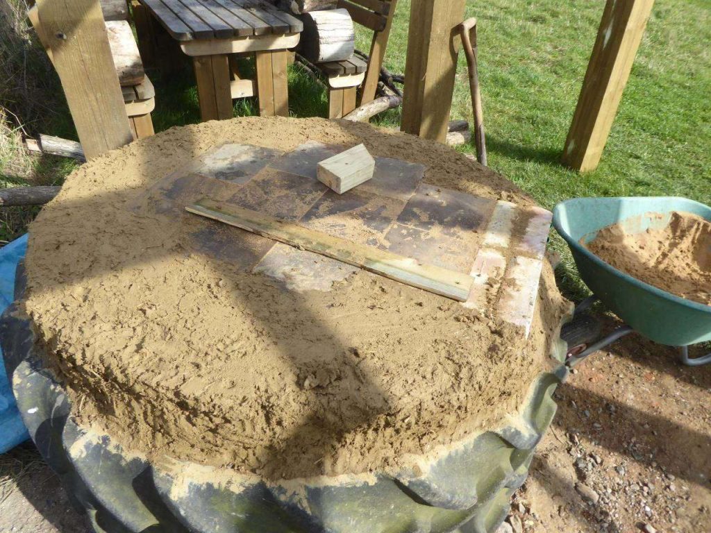 A couple of weeks before we planned to build the oven, we knew that we needed to prepare a base. The base provides the working height that you need for your oven and also the flat cooking surface. Tyres compacted with earth had worked well for us before so we decided to use this method again. This time though we used two large tractor tyres, one on top of the other, rather than the smaller car tyres. We could create a larger cooking surface this way. We filled the tyre stack with earth and glass bottles. The glass bottles help to provide insulation for the tyres against the heat. We were able to recycle the earth and bottles from the original oven which was an added bonus.