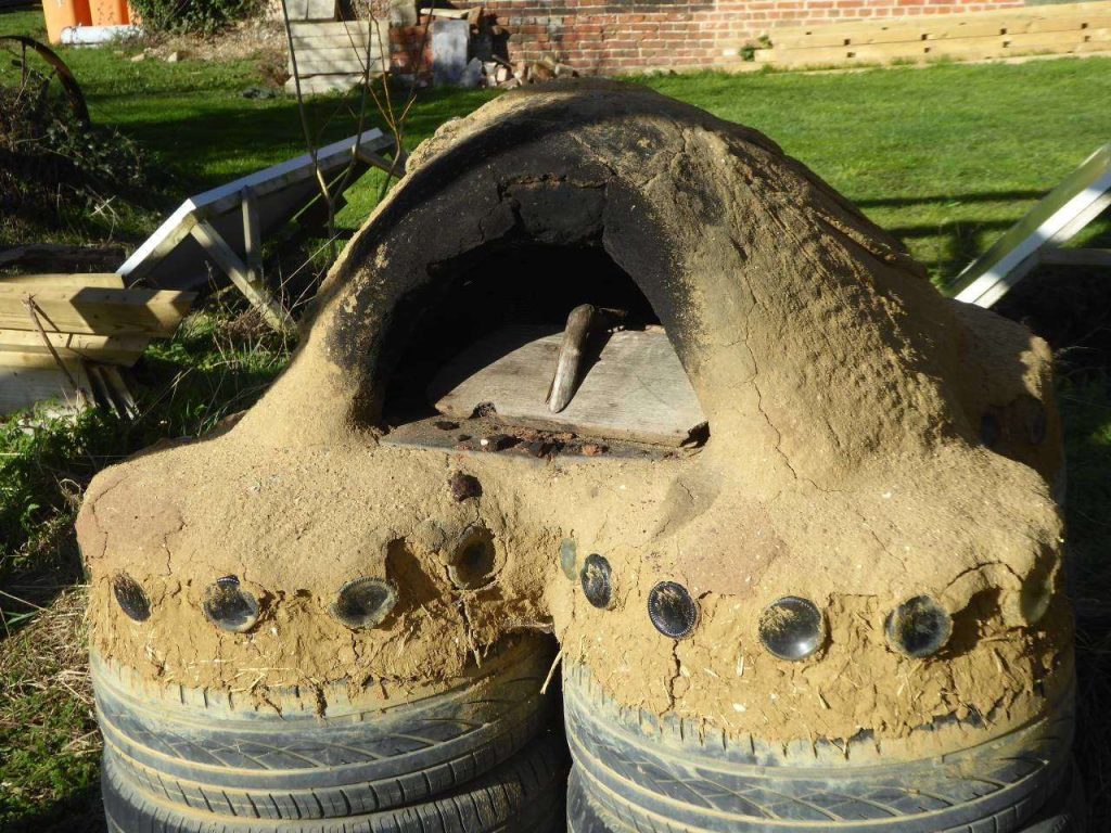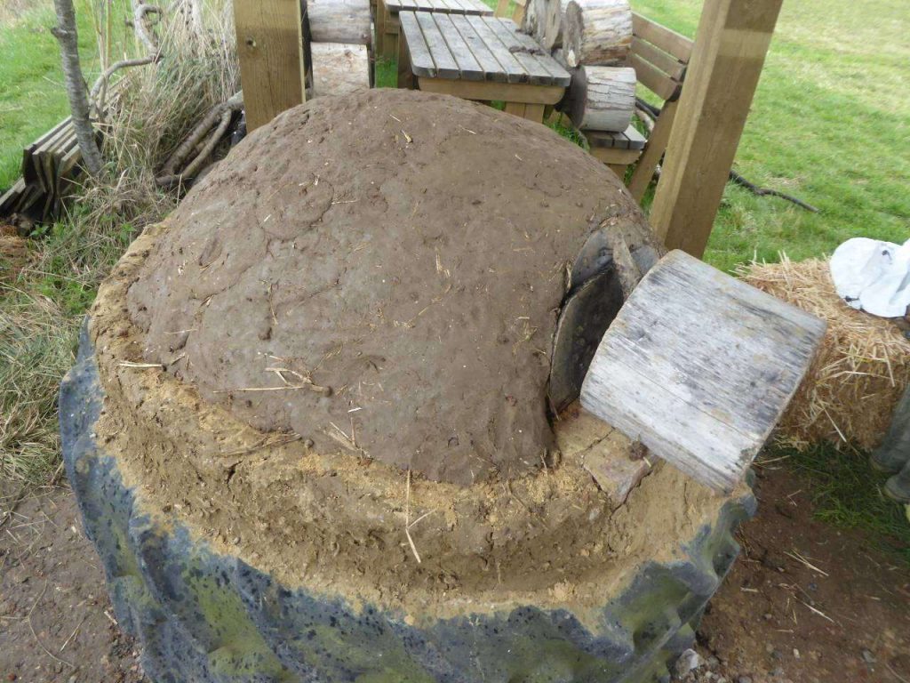 We cook one pizza at a time in the oven as they only take about a minute to cook. The tractor tyres give us enough surface space for one pizza and some space around the edge to move the hot coals to one side. We should be able to have one area heating, one area cooking a pizza and one area free inside the oven. You don’t need to give too much height to your oven and it should end up as a gently curved dome. A rough rule of thumb is that the height of the door should be about 2/3rds of the highest point of the inside of the oven. We have chosen not to add a chimney as the previous oven worked well without one. Although it provides a more reliable ‘draw’ to a fire, a chimney can carry sparks up and out of the oven; we have a wooden roof over ours, and want to avoid setting fire to it! A chimney is also a more complicated build, and it really isn’t necessary for the average home pizza oven.