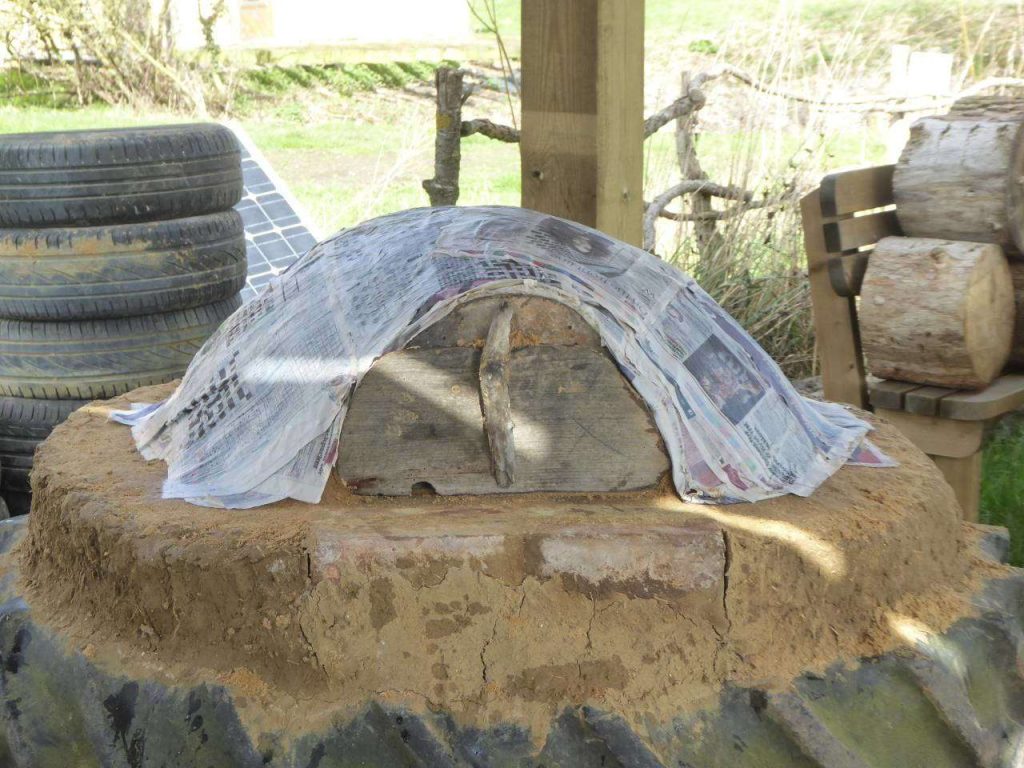 Once your cob oven is dry you can remove the door and scoop out the sand inside. The newspaper layer will still be stuck to the cob on the inside of the oven but will burn off when you light your first small fire.