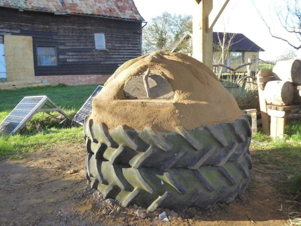 For the base – tyres, earth, glass bottles, storage heater bricks, sand, cob mix (see below)