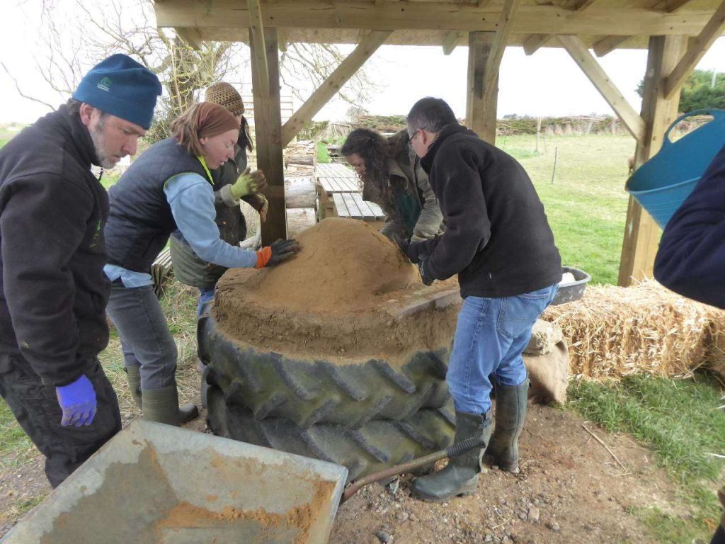To keep the sand in place we used a cob mixture to create a wall around the tyre edge. Once the sand and bricks were in place within the cob wall we then covered the top surface with more cob up to the edge of the brick ‘hot plate’. We were able to reconstitute the broken cob peices of the original oven by adding water so no new cob was needed at this point. The base was then left to dry until we were ready to build the oven.