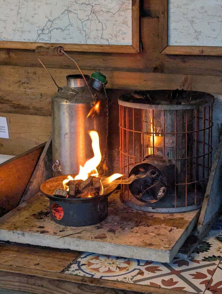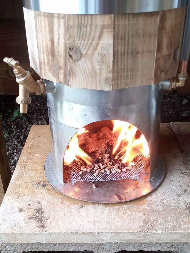 The large shower has space to get changed and hang up your clothes and towels. Water for the shower is heated using wood fired rocket stoves designed by Neel. They were built for us by a steel manufacturing company in Glasgow. After a lot of experimentation we have discovered that water is one of the most difficult substances to heat, but each of the two rocket stoves can heat enough water for a shower in just about 20 minutes. We provide free shower packs with kindling, wood pellets and fire lighters in the camp kitchen area. You can sit with a good book and a cup of tea next to your stove as you heat your shower.